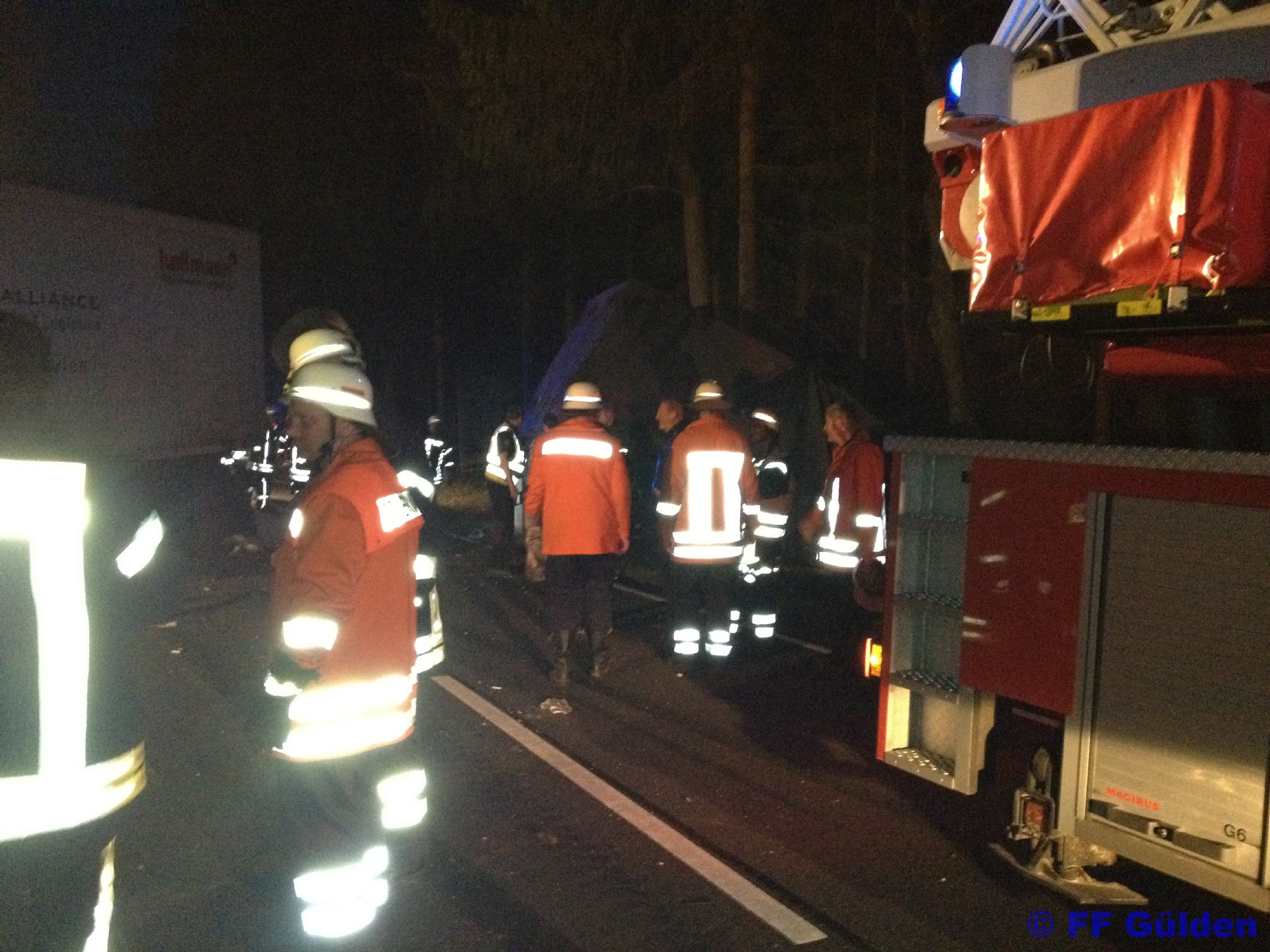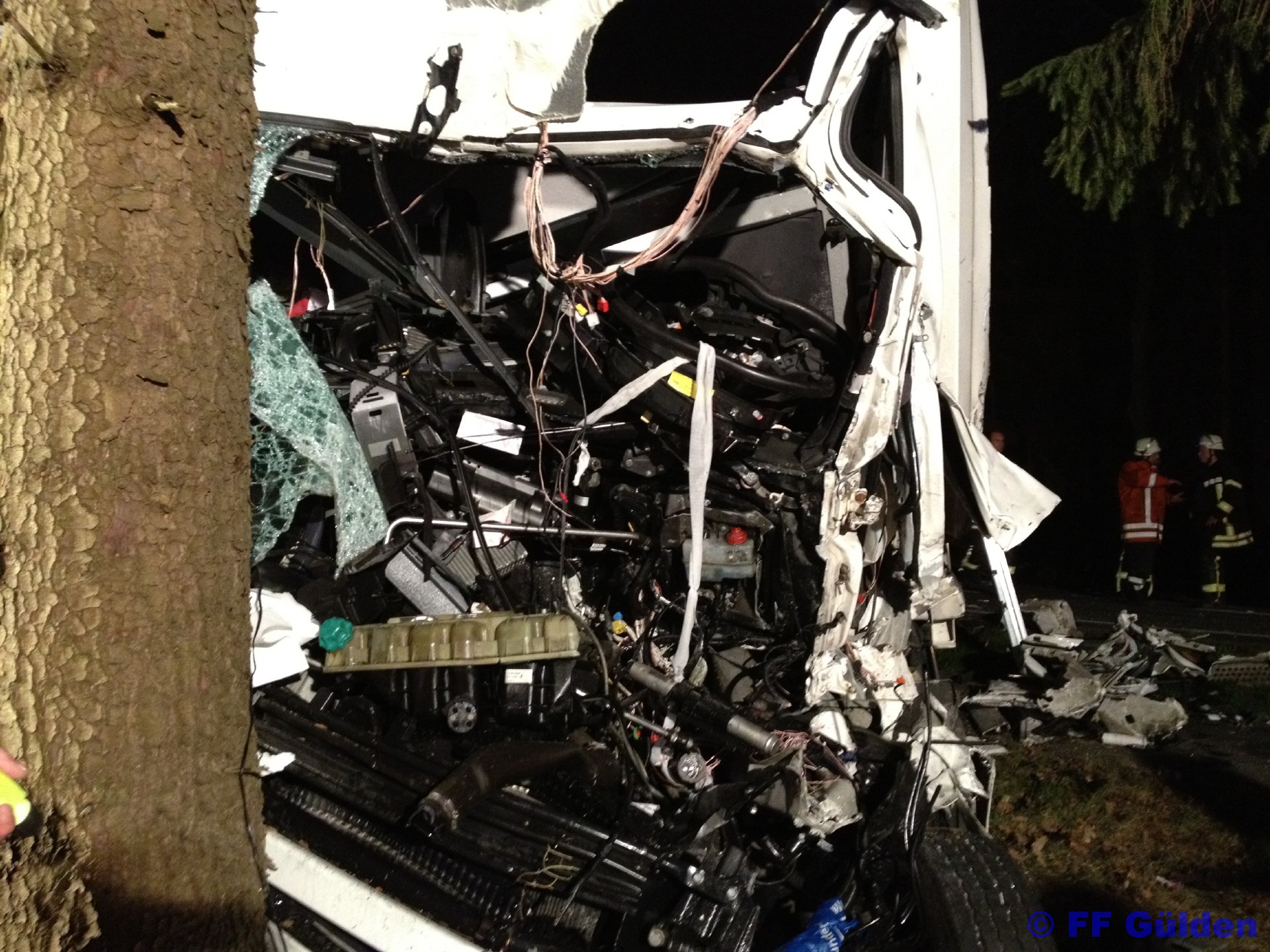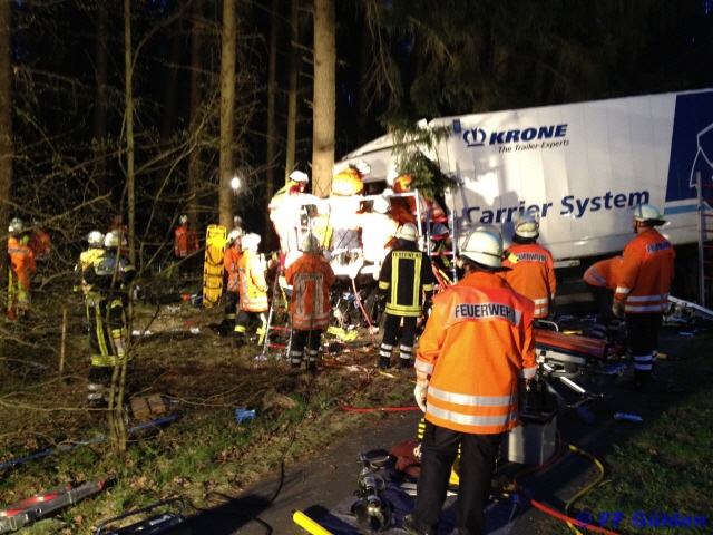 Zu einem folgeschweren Verkehrsunfall kam es in den Abendstunden des 26.03.12 auf der Bundesstraße 191 zwischen Pudripp und Karwitz. Nach derzeitigen Ermittlungen war der Anhänger eines Bundeswehr-Lkw, der von Uelzen in Richtung Dannenberg unterwegs war, im Bereich einer Rechtskurve in den unbefestigten Seitenraum gekommen. Der Anhänger des 45-jährigen Lkw-Fahrers kam dadurch gegen 18:50 Uhr ins Schlingern, geriet auf die Gegenfahrbahn und kollidierte dort mit einem entgegenkommenden Lkw, ebenfalls mit Anhänger. Dieser Lkw eines 40-Jährigen aus Stolpe (Mecklenburg-Vorpommern) kam dadurch nach rechts von der Bundesstraße ab und kollidierte dort frontal mit einem Baum. Der 40-jährige Fahrer wurde im Führerhaus eingeklemmt und verstarb noch an der Unfallstelle. Der Beifahrer des 40-Jährigen erlitt ebenfalls erhebliche Verletzungen. Der 45-jährige Fahrer des Bundeswehr-Lkw blieb unverletzt. Es entstand ein Sachschaden von mehr als 80.000 Euro. Die Bundesstraße ist für die Bergungsmaßnahmen noch bis in die Nachtstunden voll gesperrt. Die weiteren Maßnahmen dauern an.