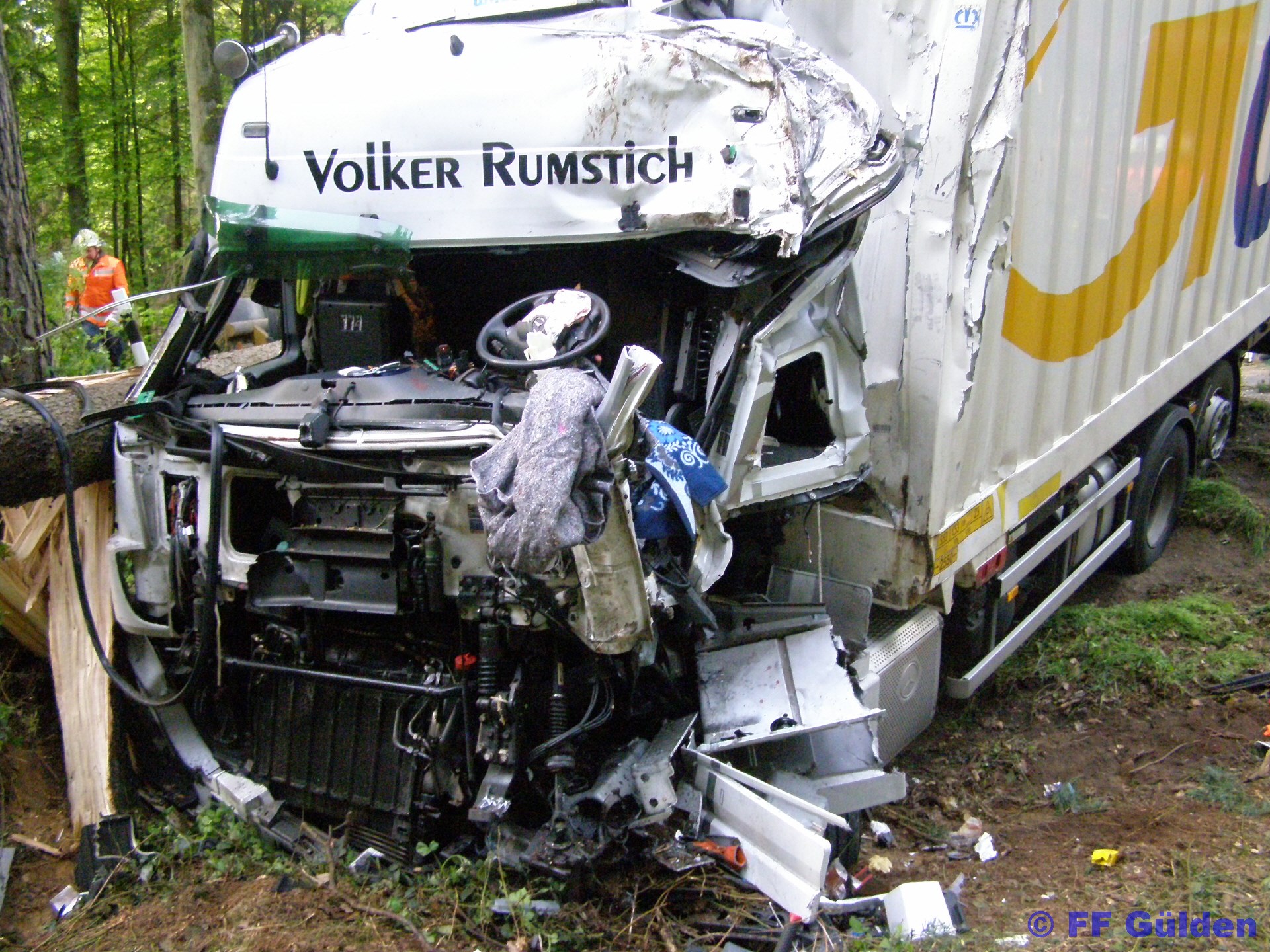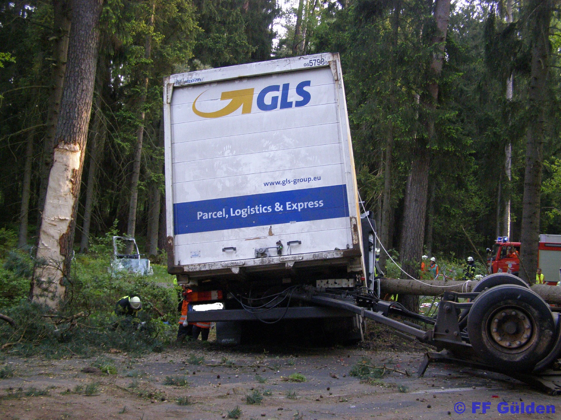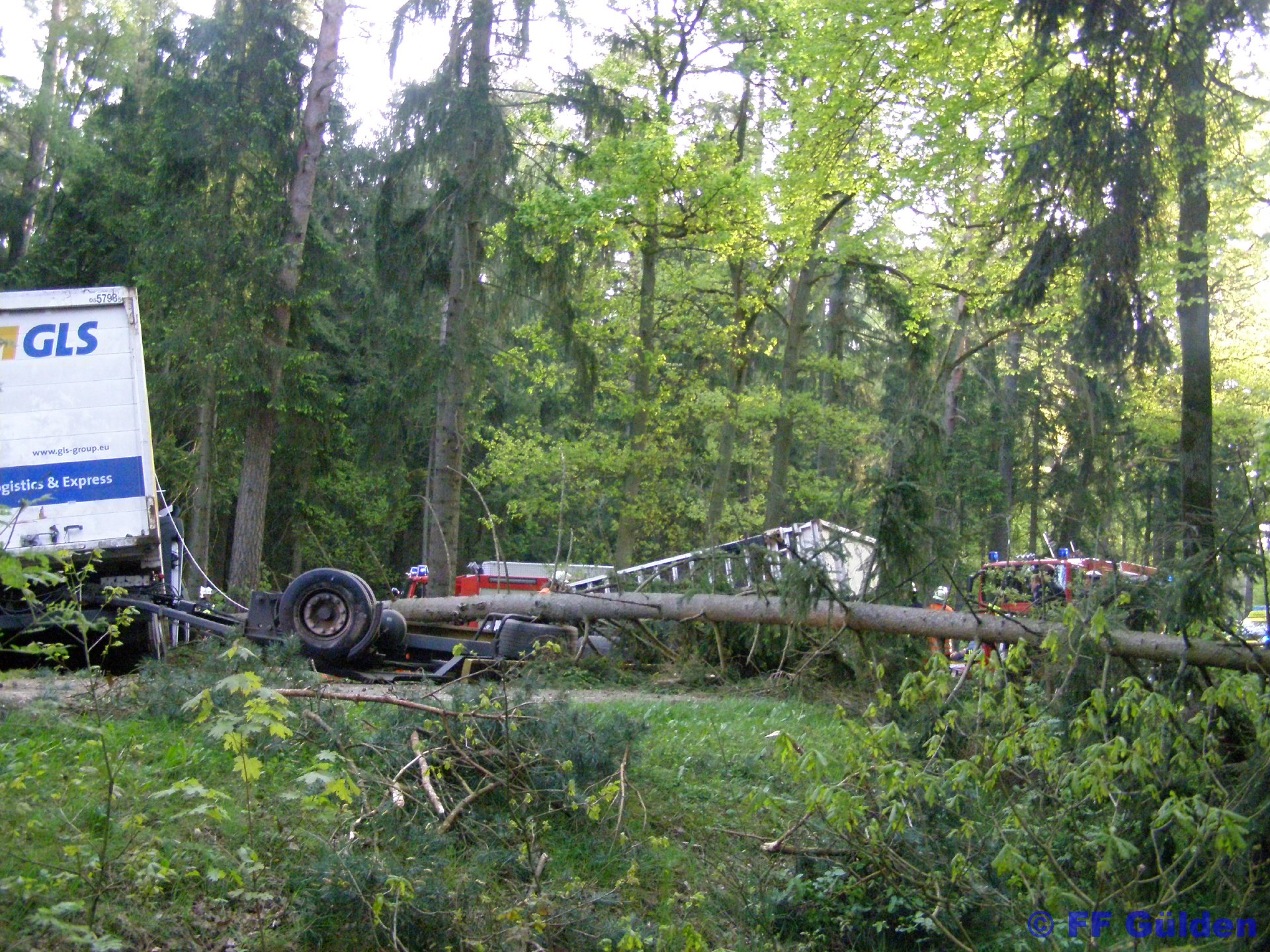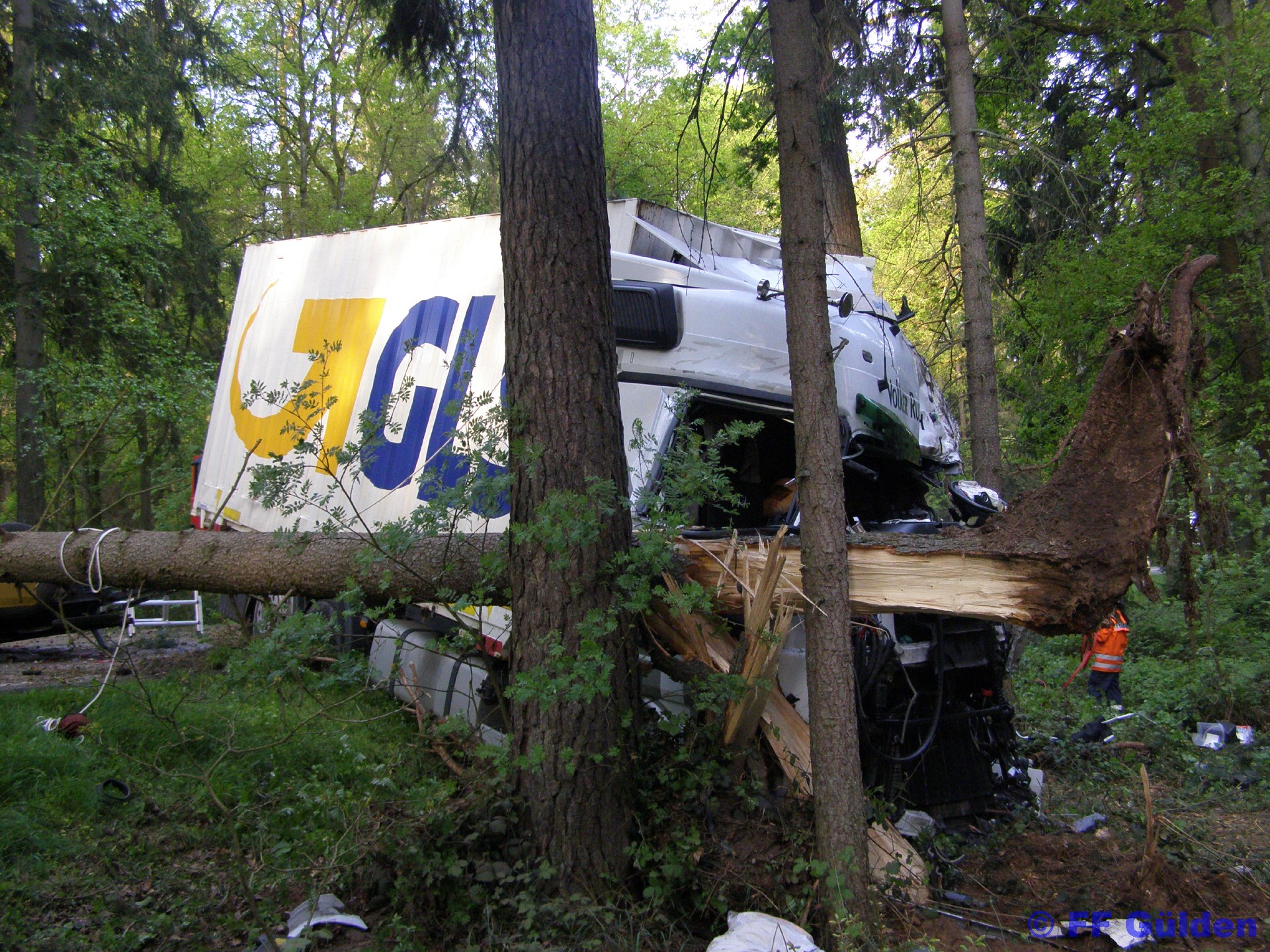 Durch die Wucht des Aufpralls wurde der, mit einem Container beladene, Anhänger herumgeschleudert. Dabei riss der Container aus der Halterung und ladete neben dem LKW. Der durch den Aufprall entwurzelte Baum viel über die Straße und begrub den Anhänger unter sich.