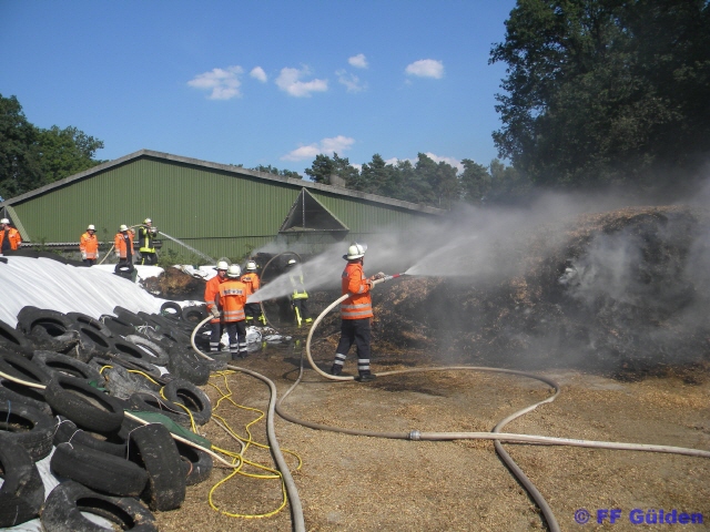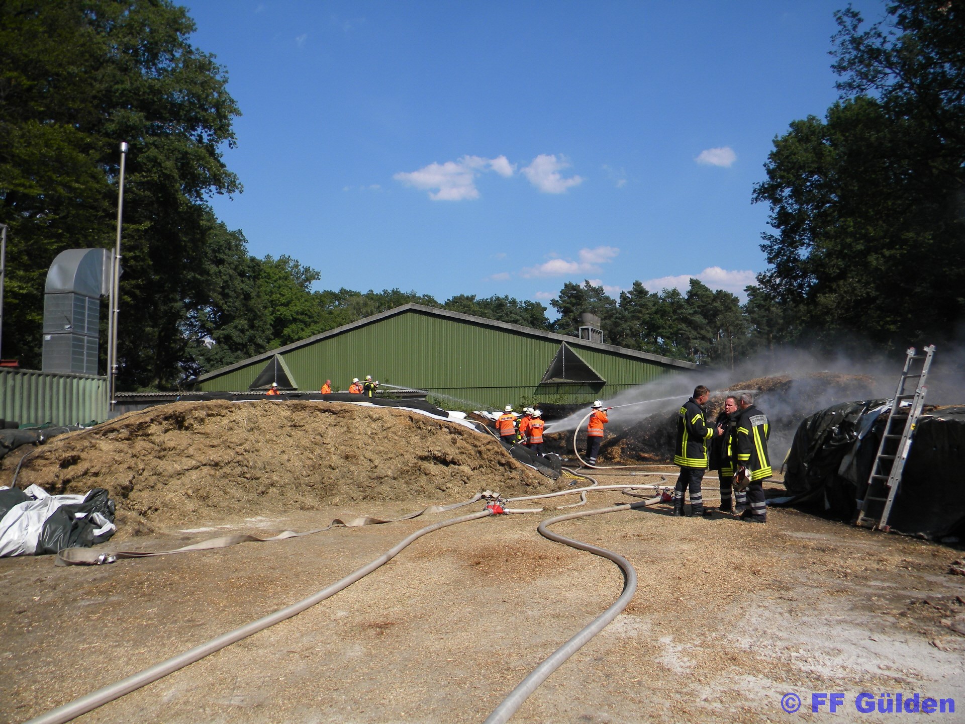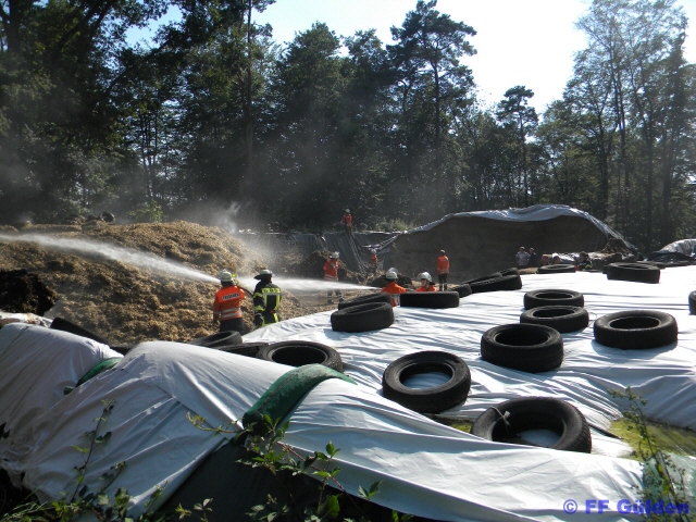 Am Nachmittag des 19.07.2014 wurde gegen 16:00 Uhr Feueralarm ausgelöst: Rundballen brennen an der Biogasanlage Spranz. Vor Ort zeigte sich das ganze Ausmaß: angelegte Strohmieten brannten rundherum, ein Eigreifen von mehreren Seiten war nötig. Rund 100 Einsatzkräfte aus Gülden, Mützingen, Karwitz, Kiefen und Dannenberg machten sich an die Löscharbeiten um ein weiteres Ausbreiten der Flammen und damit ein Übergreifen auf die Biogasanlage zu verhindern. Die heißen Außentemperaturen von über 30°C machte es den Einsatzkräften nicht einfach. Die Tanklöschfahrzeuge aus Gülden, Kiefen und Dannenberg konnten sofort mit den Löscharbeiten beginnen. Die Mützinger Wehr baute eine Standleitung vom Unterflurhydranten auf. Das eingelagerte Stroh hat sich vermutlich von selbst entzündet; nichts ungewöhnliches bei diesen hochsommerlichen Temperaturen. Die gesamten Mieten wurden abgetragen und nacheinander mit Wasser durchtränkt. Glutnester wurden auch zuunterst ausgemacht und gelöscht.