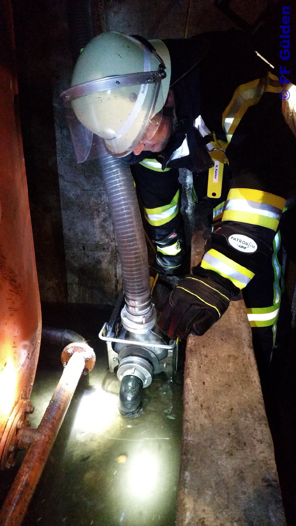 Während des Unwetters über der Gemeinde Zernien hatte sich eine größere Wassermenge den Weg zum Keller eines Bewohners gesucht. Die Glasscheibe vor dem Kellerfenster hielt dem Druck der Wassermengen nicht mehr stand und zerbrach. Hierdurch liefen ca. 1000 Liter Wasser in den Keller. Mittels einer Chiemseepumpe pumpten wir das Wasser aus dem Keller.