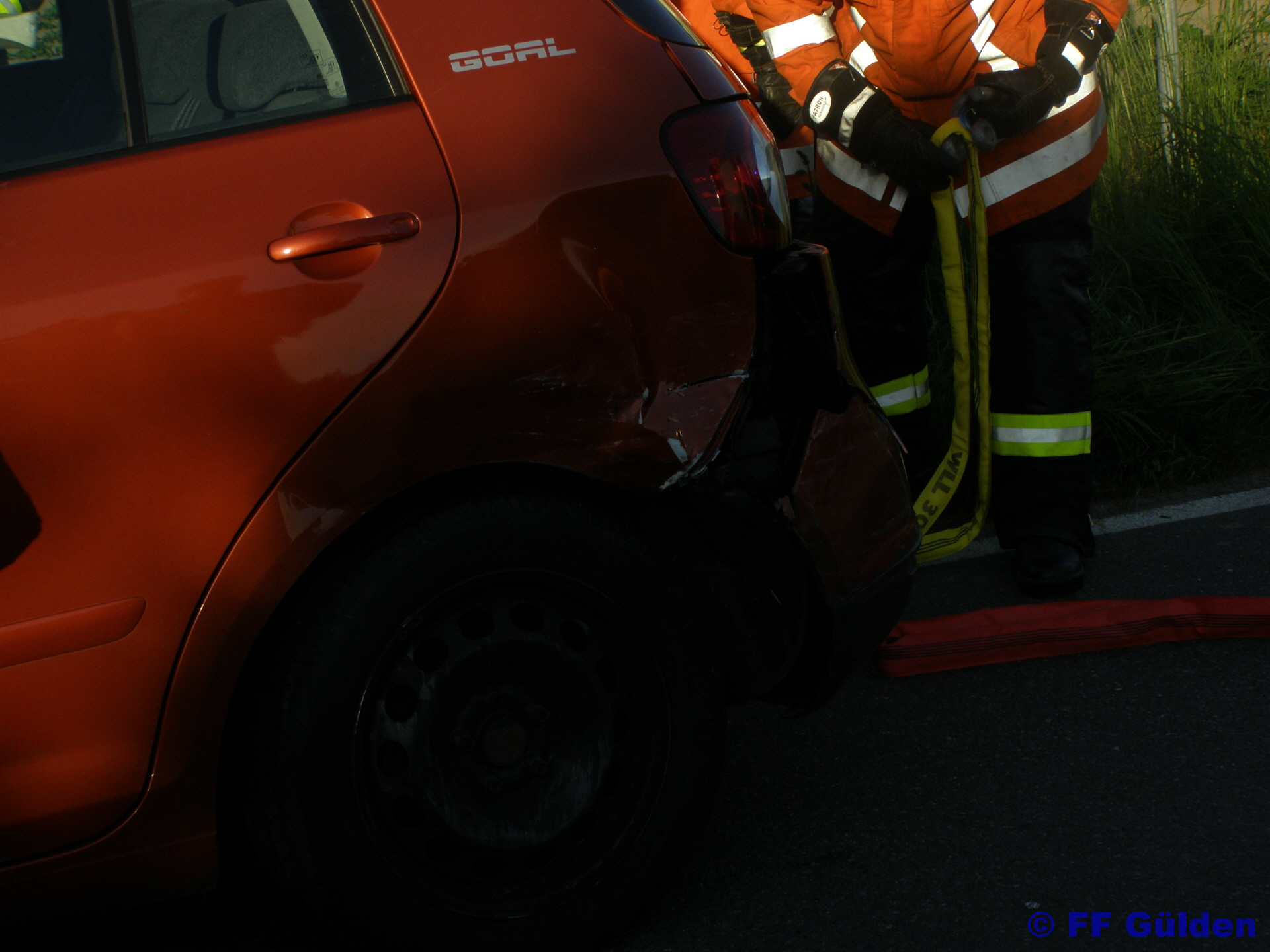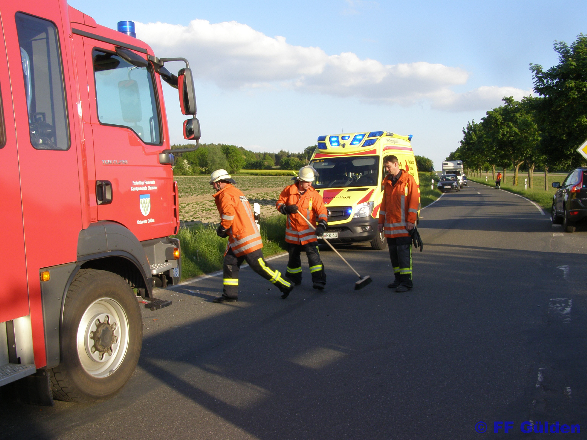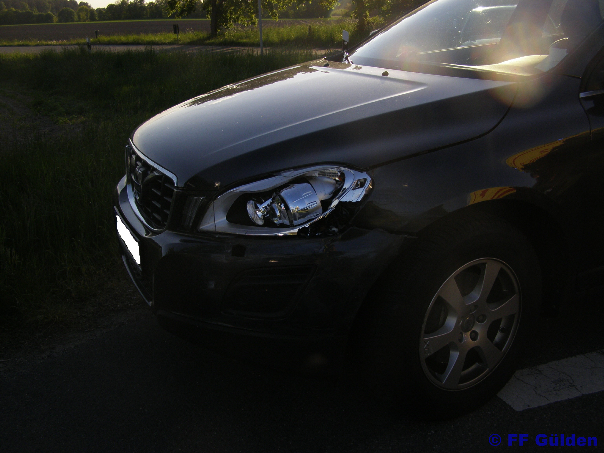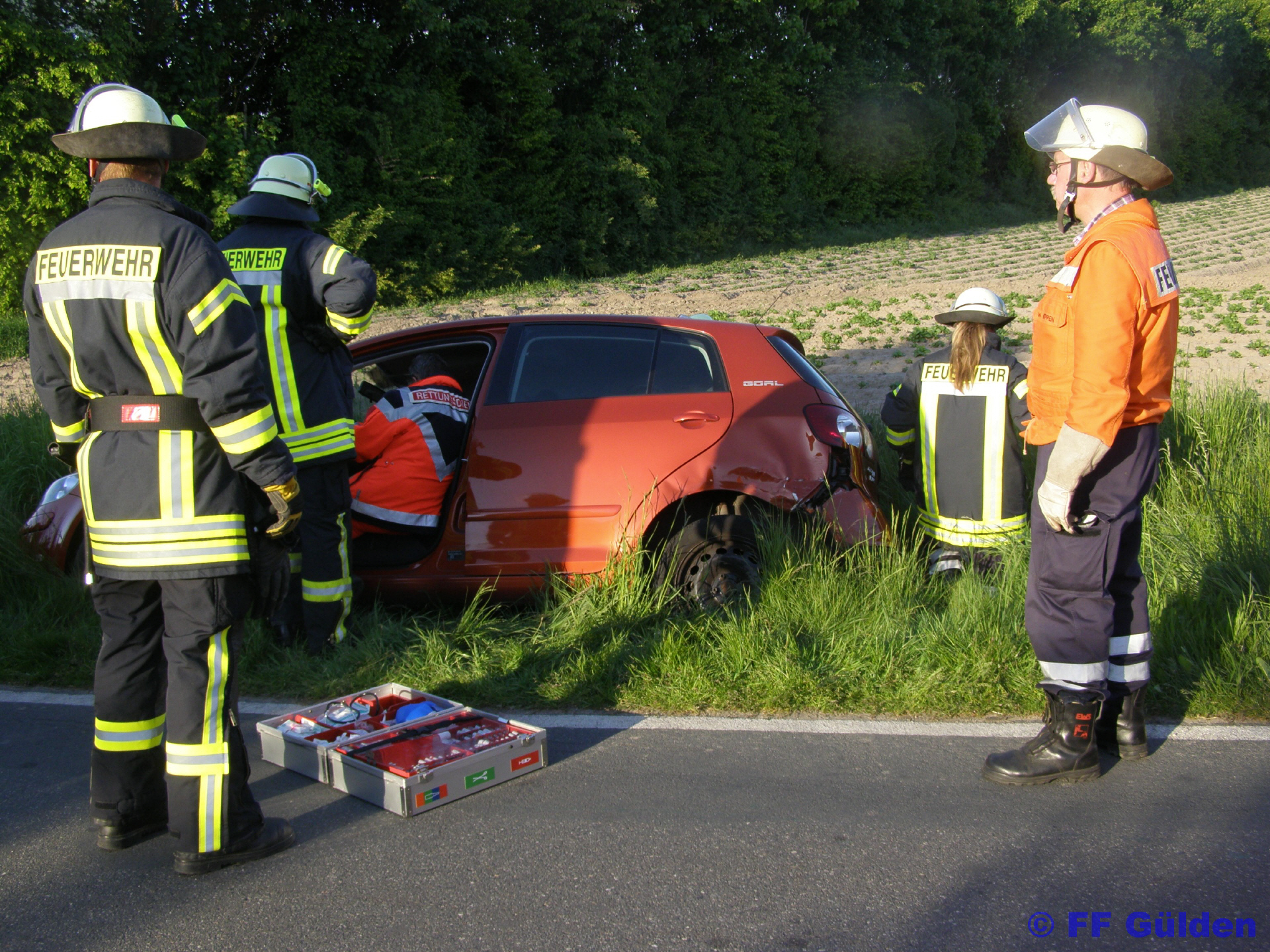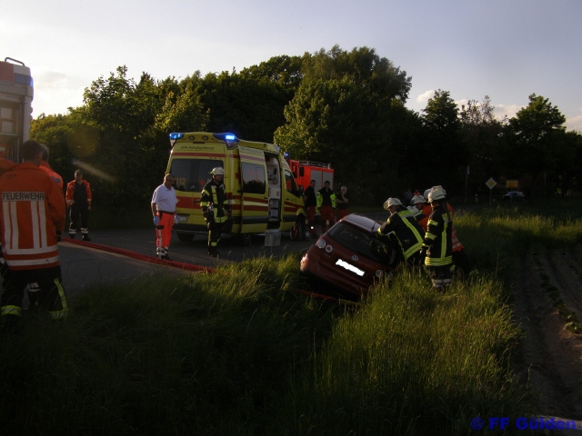Die Feuerwehr Gülden zog das Fahrzeug aus dem Graben und die Person konnte aus dem Fahrzeug steigen und wurde kurz im RTW betreut.