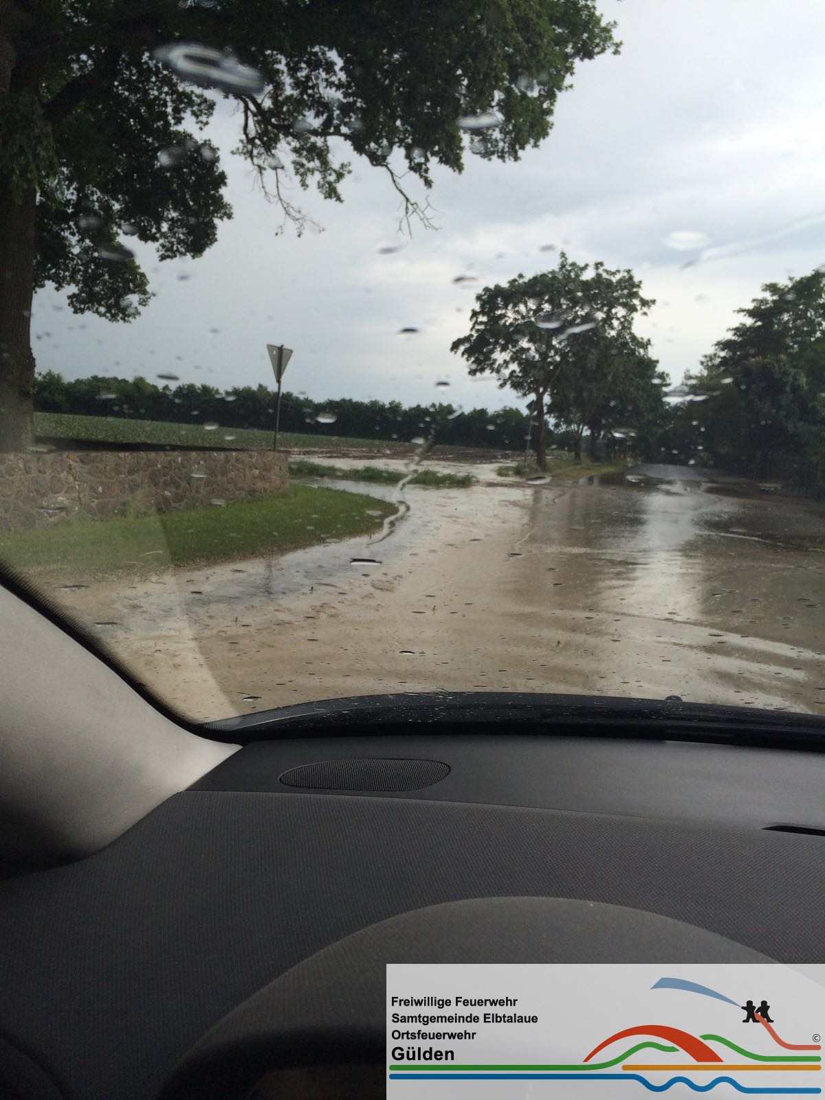 Die Strasse in Gülden war durch den Starkregen verschmutzt. Die Feuerwehr wurde durch die Gemeinde Zernien alarmiert und hat die Strasse wieder gereinigt.