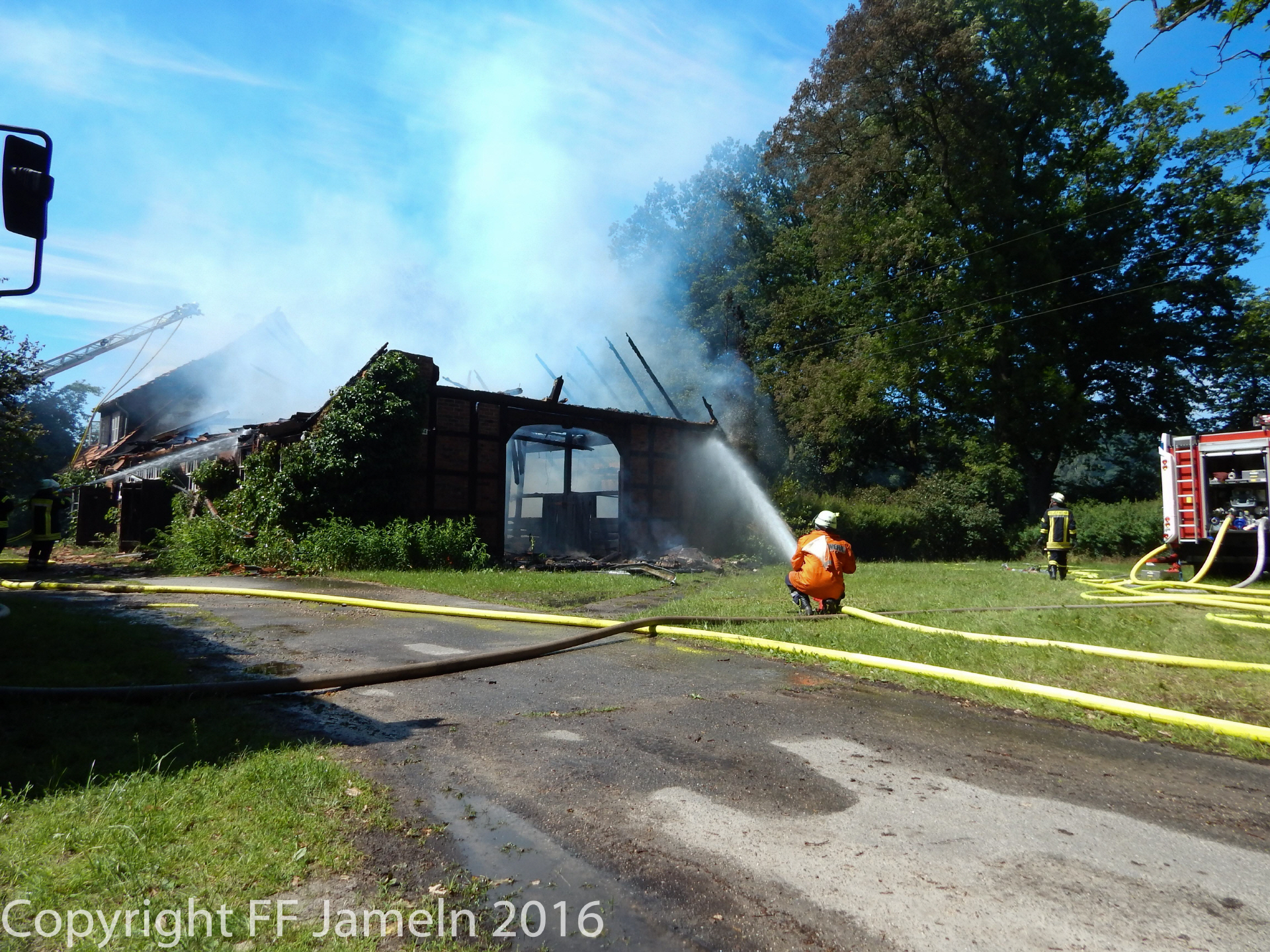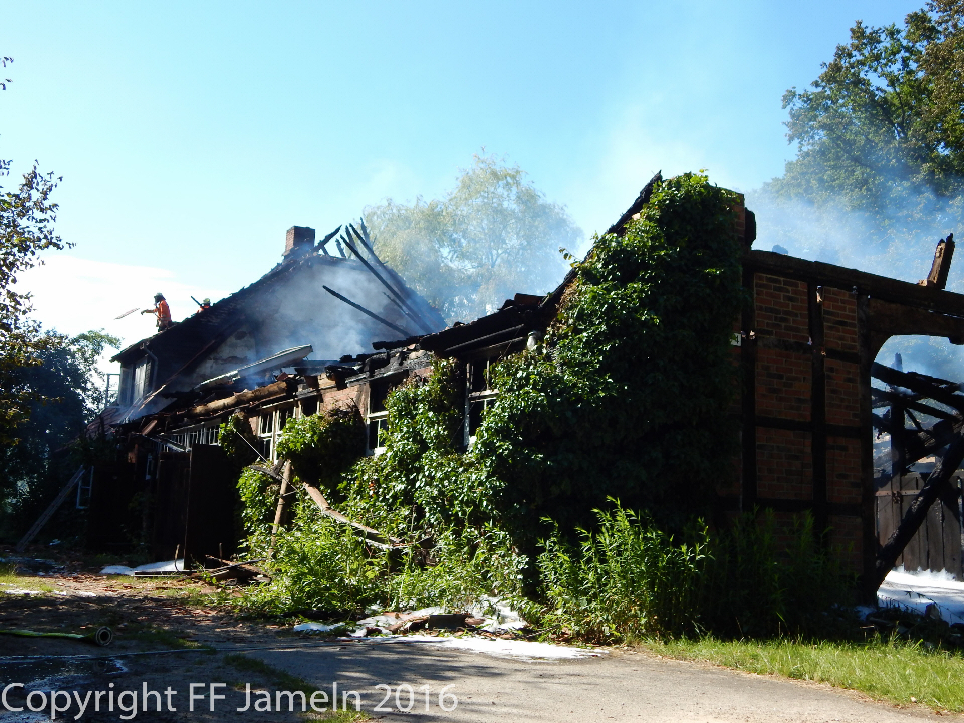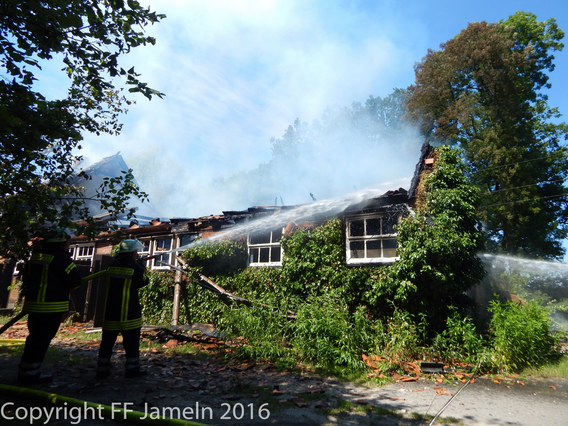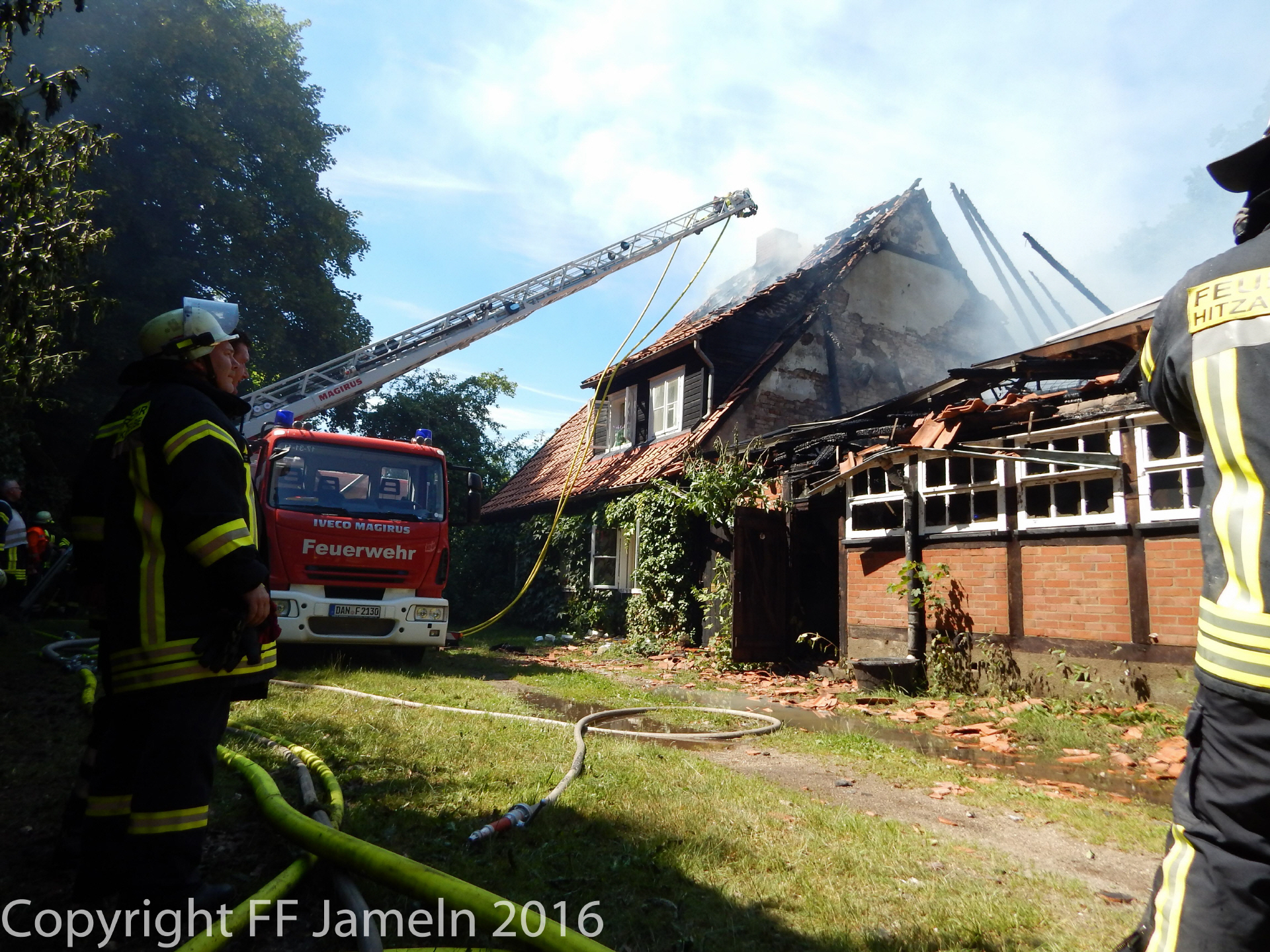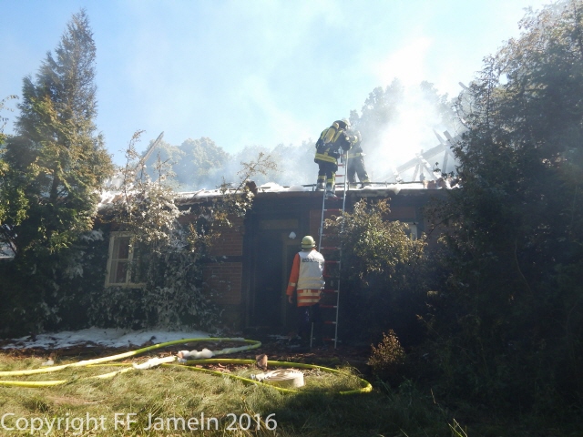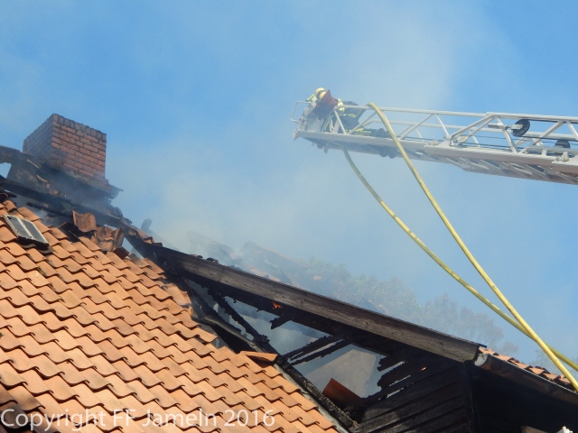 Die Flammen breiteten sich jedoch schnell auf das gesamte Gebäude aus, die Feuerwehr, die mit rund 80 Einsatzkräften aus dem ganzen Nordkreis anrückte, konnte trotz schnellen Eingreifens nichts mehr retten. Behindert wurden die Löscharbeiten zum einen durch Wassermangel: Lediglich ein Hydrant habe zunächst zur Verfügung gestanden, hieß es. Erst später gelang es, eine weitere Wasserleitung aus der Feldmark zum Unglücksort zu verlegen. Zum anderen Befand sich auf dem Dach des Hauses eine Photovoltaikanlage. Die beiden Bewohner des Hauses waren zum Zeitpunkt des Unglücks nicht im Gebäude. Die Brandursache steht noch nicht fest, die Polizei hält jedoch einen technischen Defekt an der Photovoltaikanlage, die auf dem Dach des Hauses angebracht war, für "nicht unwahrscheinlich". Den Schaden bezifferte die Polizei vorläufig auf weit mehr als 250 000 Euro.