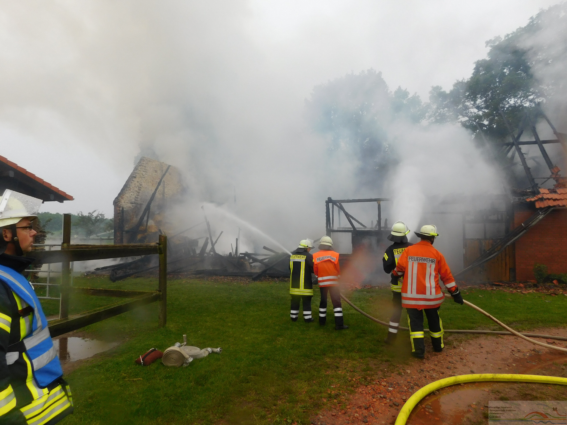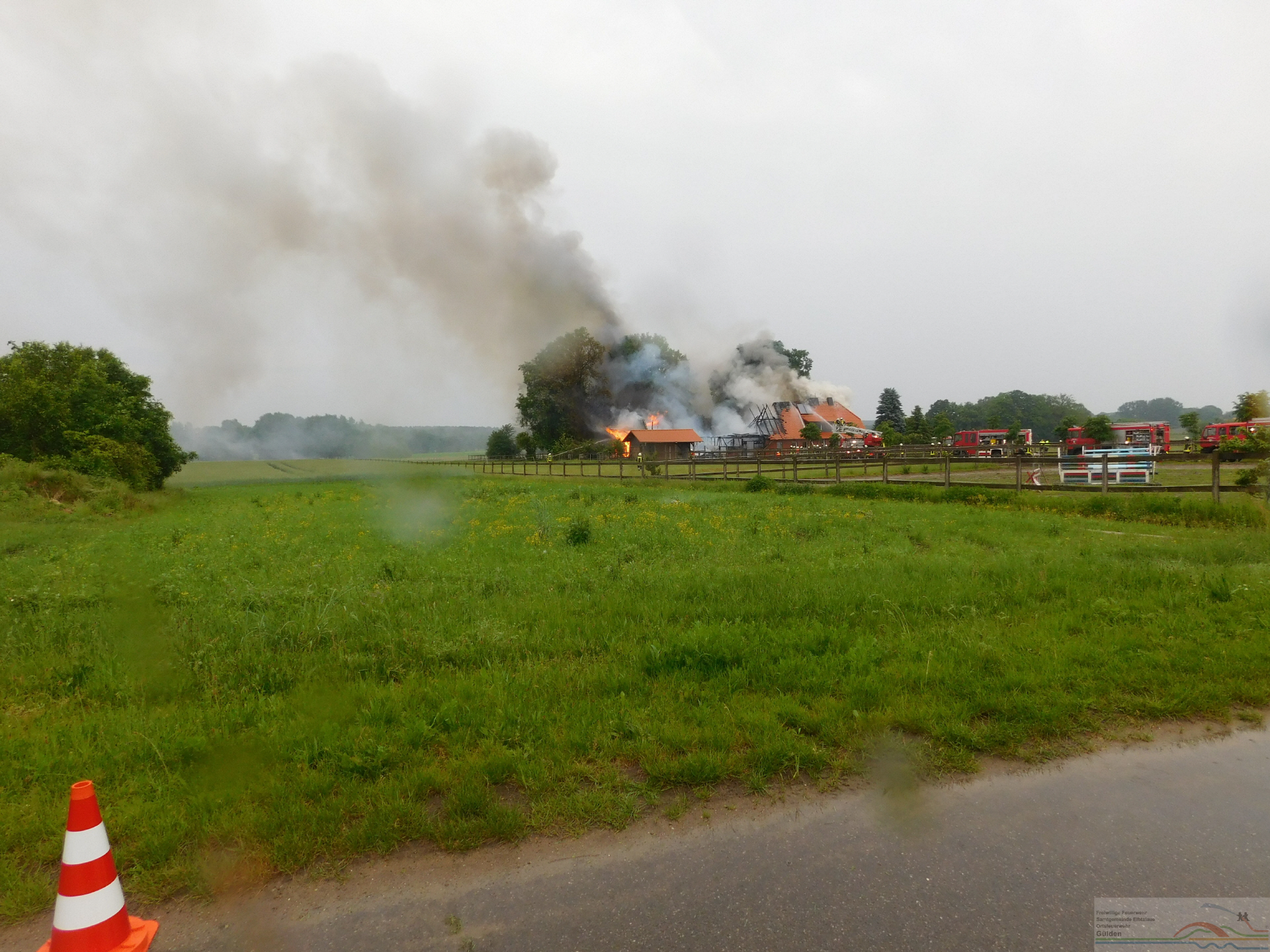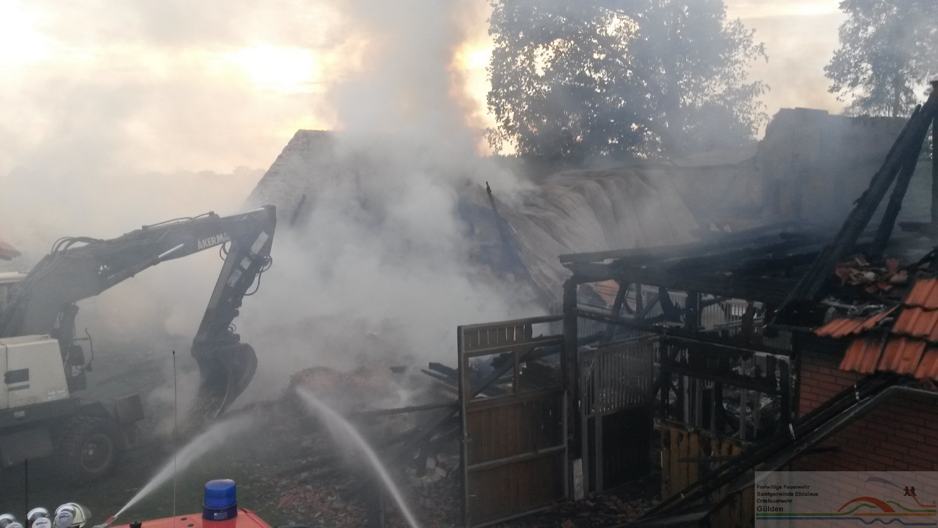 Es war wohl ein Blitz: Ein Feuer hat am frühen Montagabend einen ehemaligen Bauernhof in Glieneitz in der Gemeinde Zernien zerstört. Gegen 17.15 Uhr waren die Feuerwehren alarmiert worden, bei ihrem Eintreffen stand die Scheune, die an das Wohnhaus angrenzte, bereits im Vollfeuer. Auch das Wohnhaus brannte zum Teil, die Feuerwehren aus der gesamten Samtgemeinde Elbtalaue konzentrierten sich daher zunächst darauf, das noch nicht vollständig brennende Gebäude zu retten.