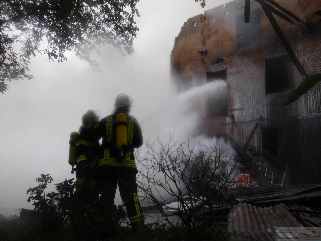 Um genug Wasser für die Löscharbeiten heranzuschaffen, mussten die mehr als 100 Einsatzkräfte lange Schlauchleitungen verlegen. Zudem gefährdete ein zu diesem Zeitpunkt noch immer tobendes Gewitter mit weiteren Blitzeinschlägen und heftigem Regen den Einsatz - vor allem den der Drehleiter.
