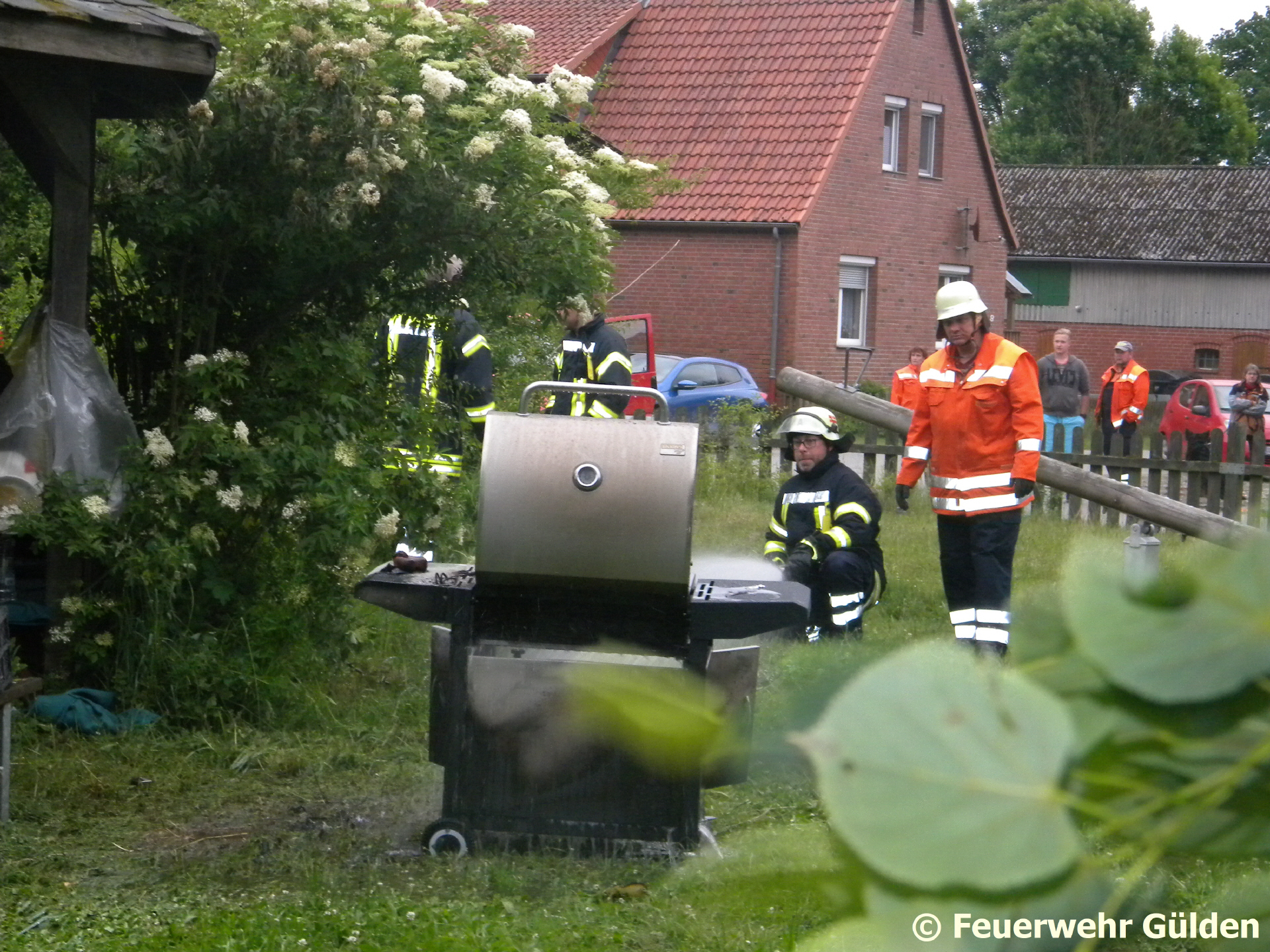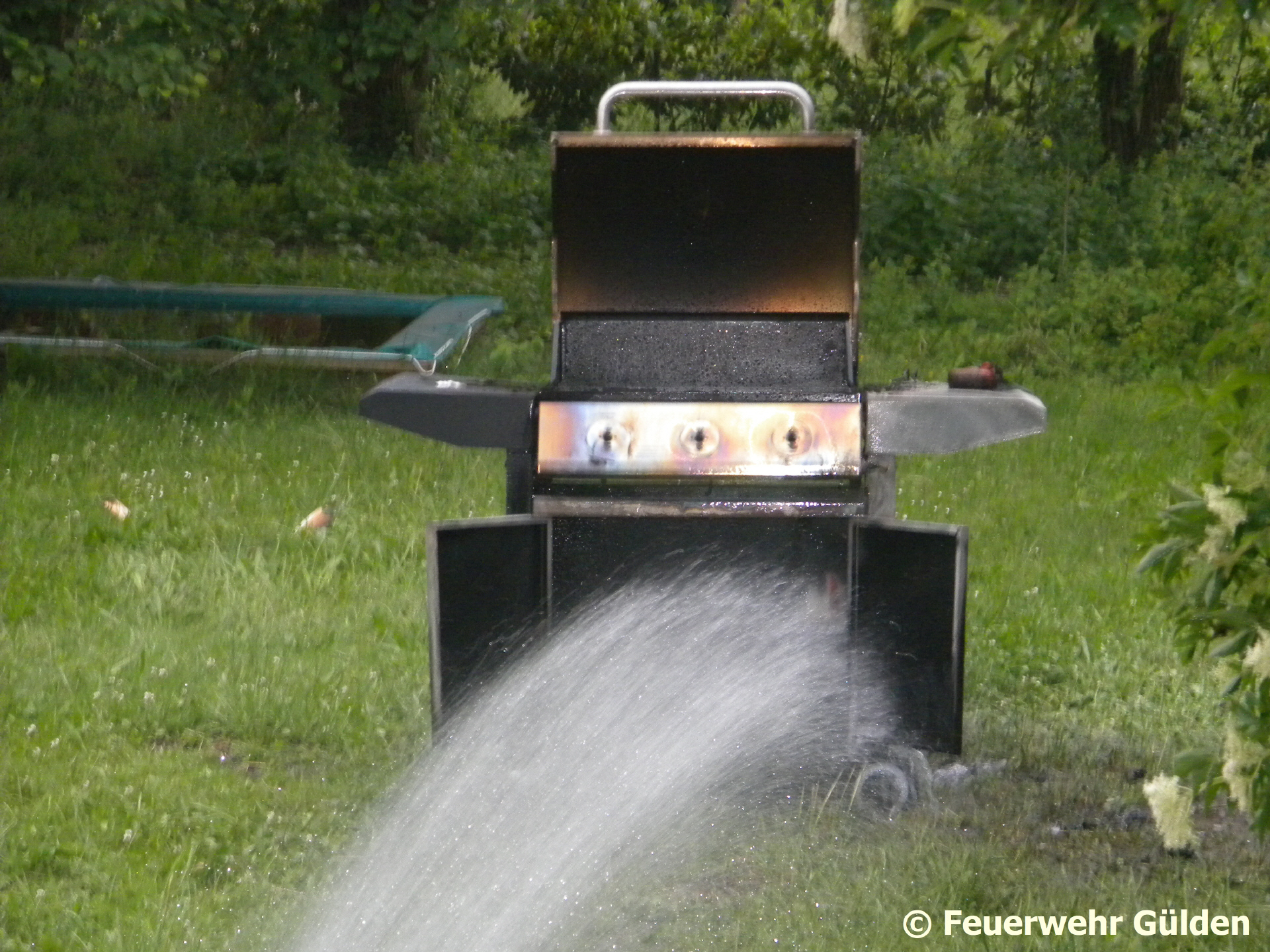 Eine Gruppe Jugendliche hatten sich den geselligen Abend mit Grillfleisch und Salat wohl gemütlicher vorgestellt. Stattdessen fing der Gasgrill Feuer; Flammen schlugen auf die Gasflasche nieder und entzündeten sich am austretenden Gas, die Gasleitung war durchgeschmort. Mit einem C-Rohr konnte das Feuer gelöscht und die Gasflasche gekühlt werden. Austretendes Gas wurde kontrolliert abgelassen und die durchnässte Brandstelle nach Aufnahme durch die Polizei an die feiernde Gruppe übergeben.