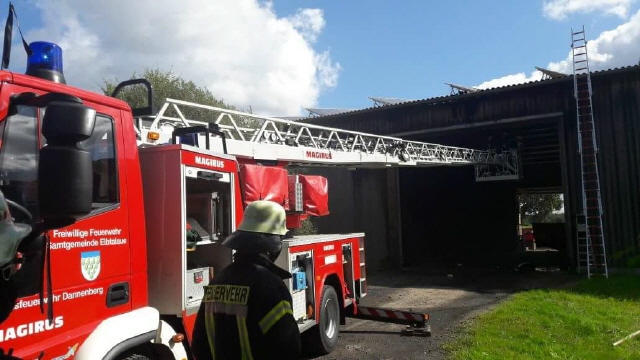 Schlimmeres konnten zahlreiche Wehren aus der Samtgemeinde Elbtalaue bei einem Dachbrand an einer Scheune verhindern. Vermutlich durch einen technischen Defekt entstand am Scheunendach auf einem Hof in Timmeitz (Zernien) ein Schwelbrand, der durch das beherzte Eingreifen der Feuerwehrkräfte aus Gülden und Dannenberg schnell unter Kontrolle gebracht wurde. Die eingesetzte Drehleiter aus Dannenberg öffnete das Scheunendach am Brandherd und prüfte mit der Wärmebildkamera nach möglichen weiteren Glutnestern. Nach einer Stunde konnten die Wehren aus Dannenberg, Karwitz, Gülden, Kiefen und Mützingen wieder abrücken. Der bereitgestellte Rettungswagen zog ebenfalls von dannen, die Polizei ermittelt. Auf dem Scheunendach sind Solarenergiemodule verbaut, die EVE trennte diese vom Stromnetz.