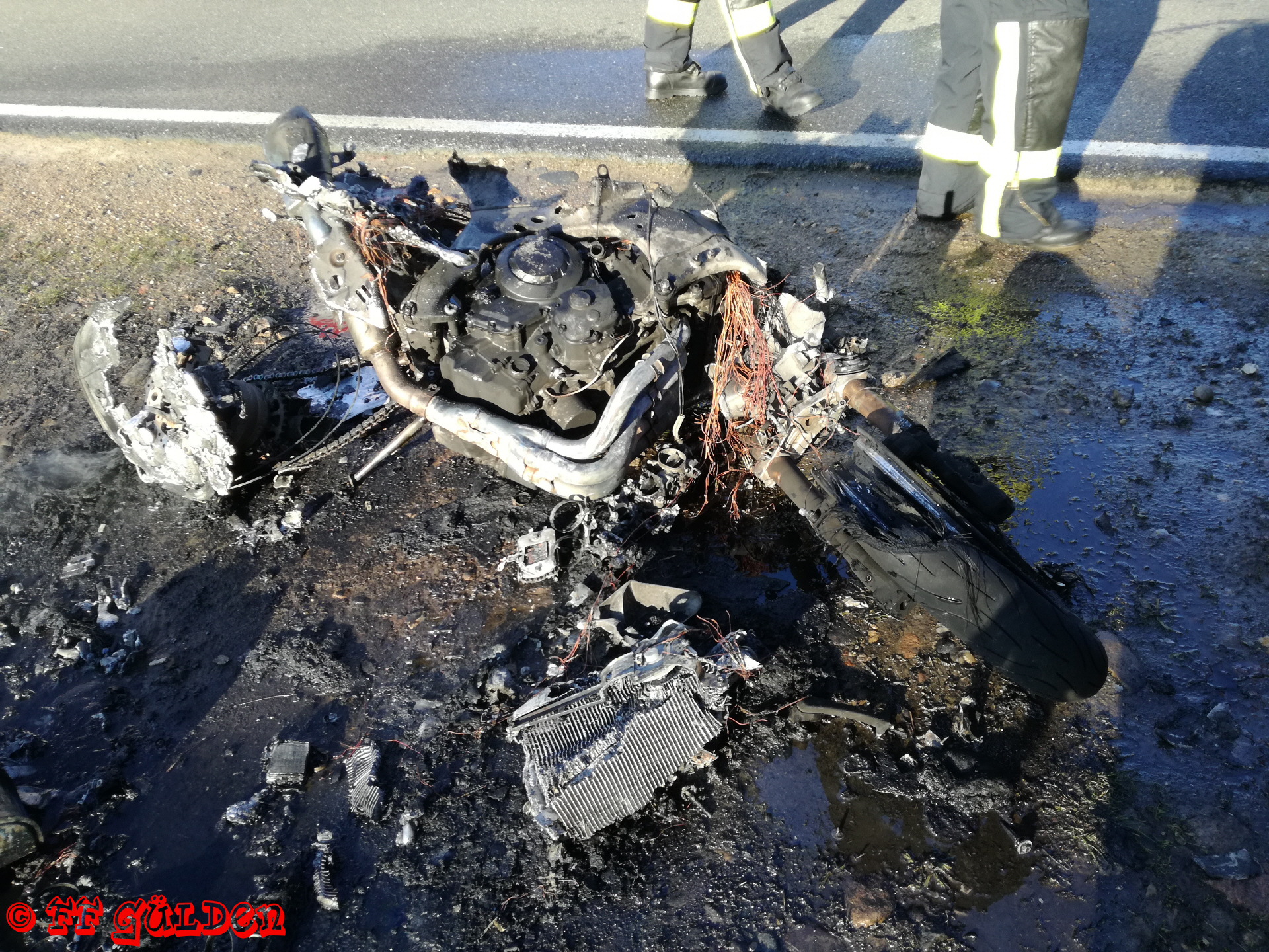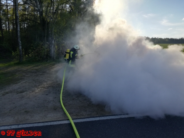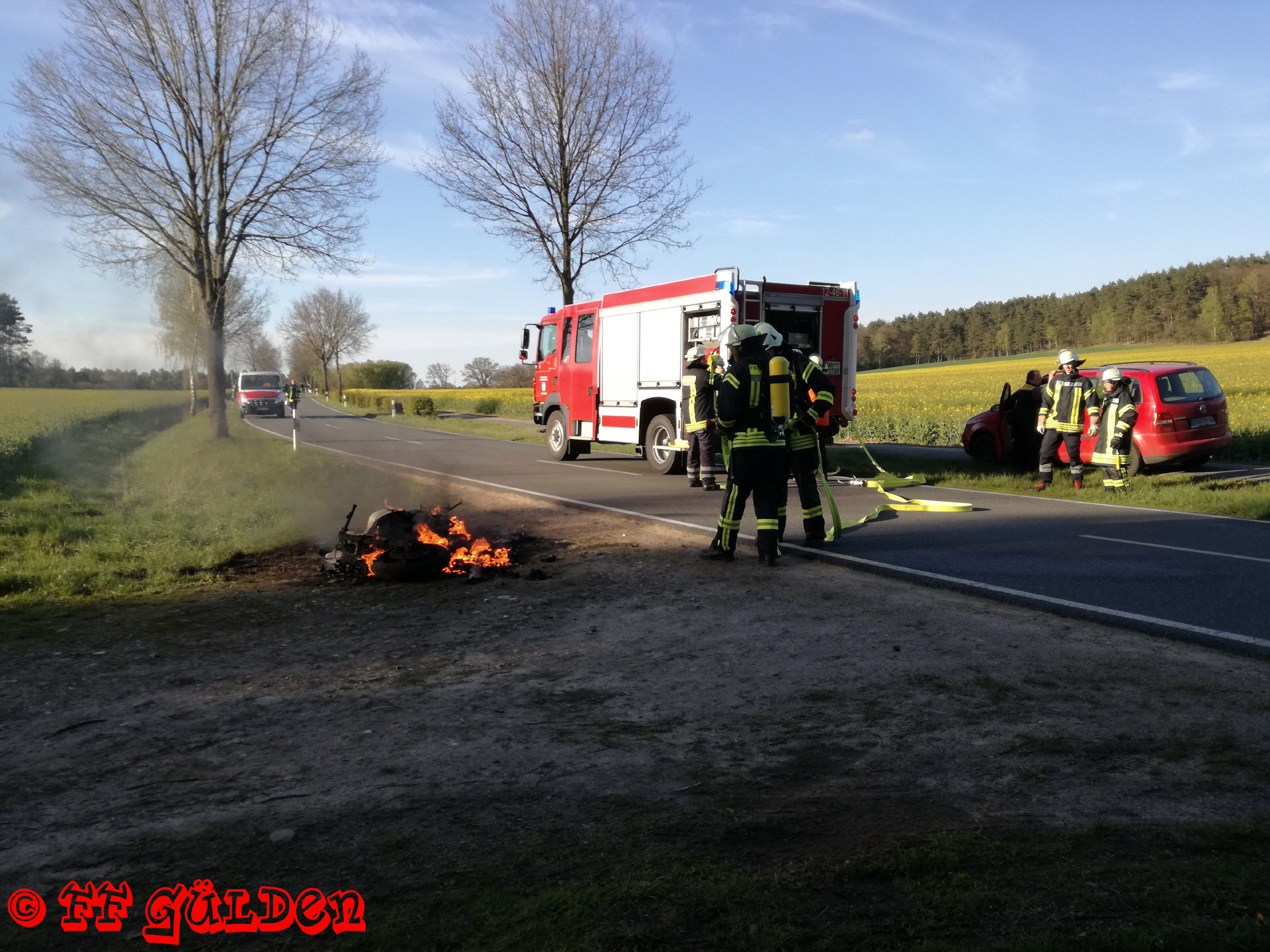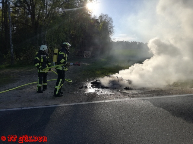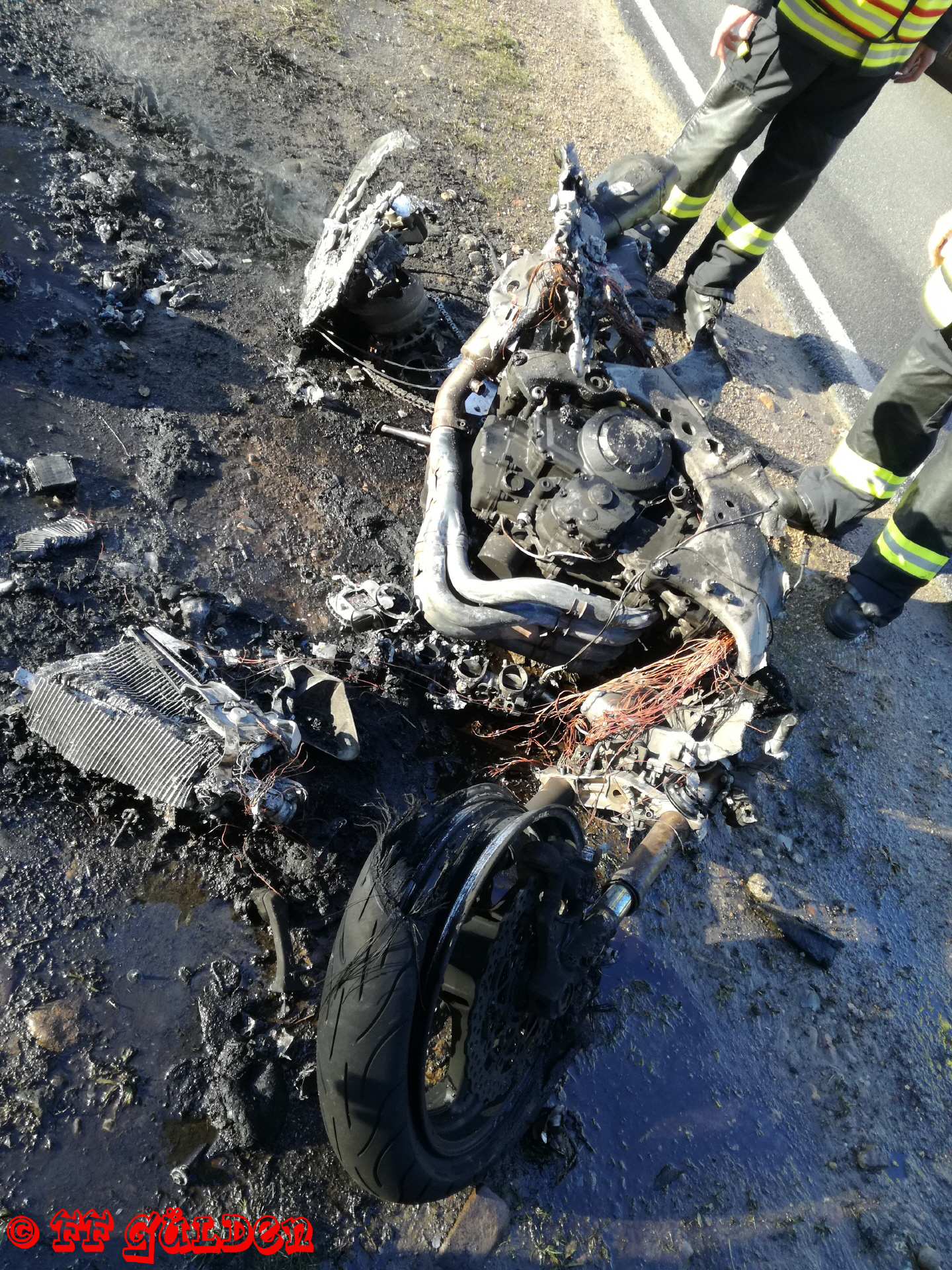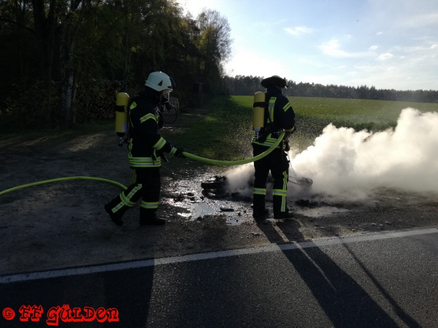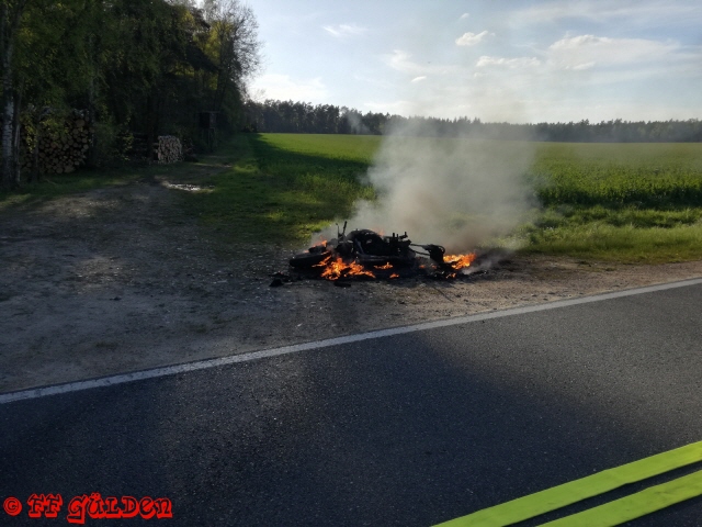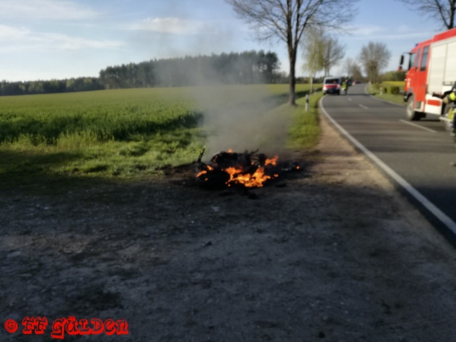 Am 30 April wurden wir zu einem brennenden Motorrad auf der Kreisstraße 8 zwischen Pudripp und Metzingen alarmiert. Aufgrund eines technischen Defekts fing es Feuer. Als wir am Einsatzort angekommen sind, brannte das Fahrzeug in voller Ausdehnung. Wir löschten es unter Atemschutz mit ca. 800 Litern Wasser ab.