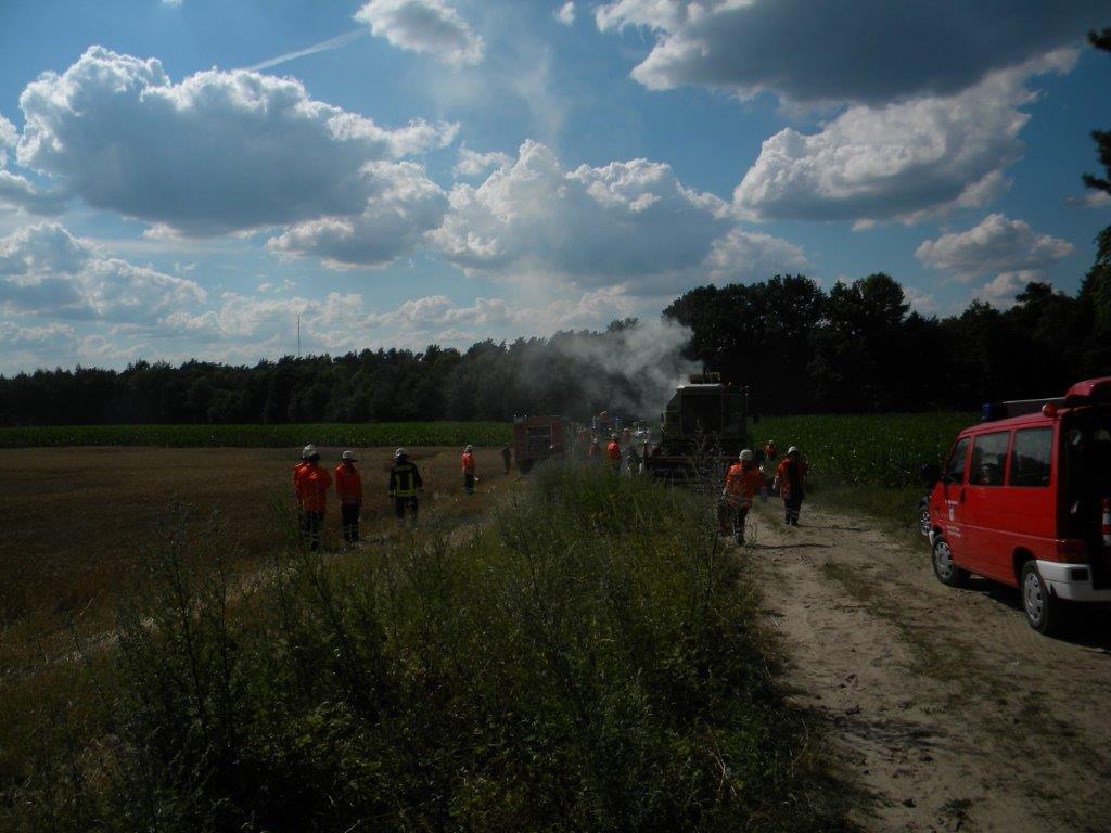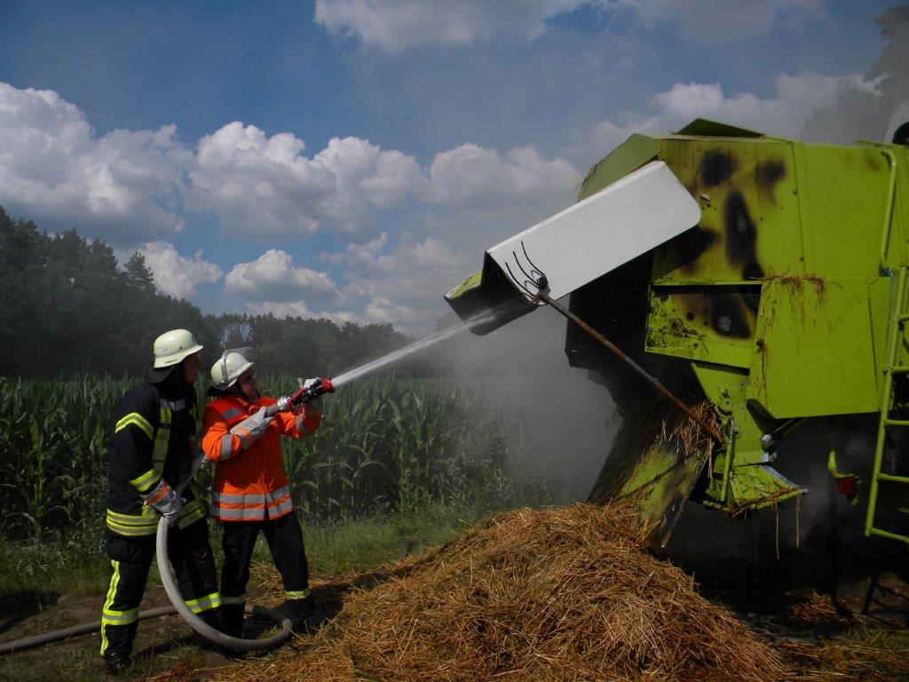 Wegesrand verläuft, begannen Helfer schon mit Löscharbeiten am Mähdrescher. Eine starke