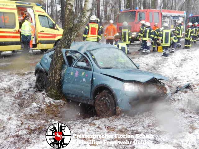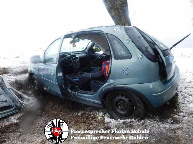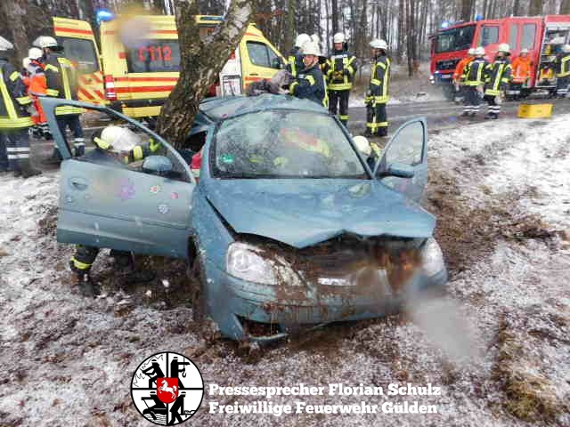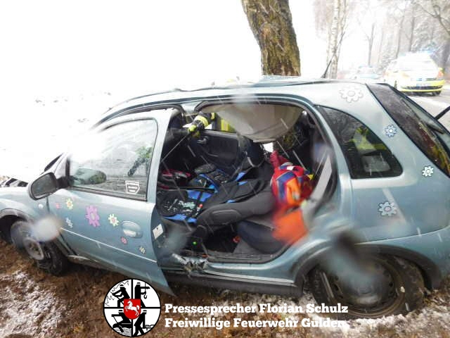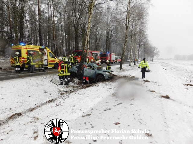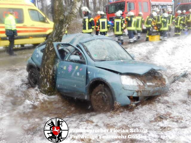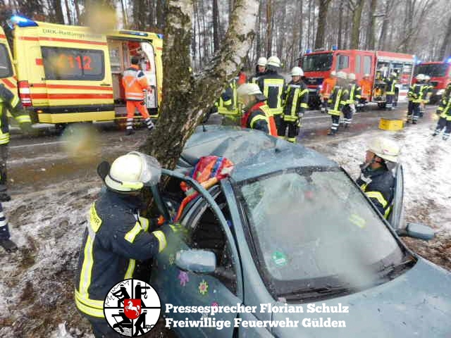 fs. Zernien Vermutlich aufgrund des schlechten Wetters kam am Karsamstag eine Fahrerin in Zernien in Fahrtrichtung Dannenberg nach links von der Straße ab und prallte mit der Beifahrerseite gegen einen am Straßenrand stehenden Baum. Die Fahrerin konnte ihr Fahrzeug nicht selbständig verlassen. Die Feuerwehr Gülden entfernte mit hydraulischem Rettungsgerät die B-Säule des Fahrzeugs und schuf so eine Rettungsöffnung, um die Fahrerin Patientengerecht aus dem Fahrzeug zu befreien. Anschließend wurde sie mit dem Rettungswagen in die Capio Elbe-Jeetzel-Klinik nach Dannenberg gebracht. Das Fahrzeug hat nur noch Schrottwert. Die Unfallermittlungen dauern an.